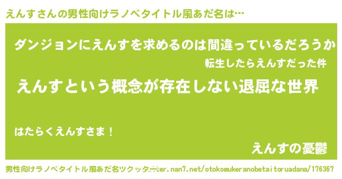 | 女子向けラノベタイトル風あだ名 | 『異世界で失敗しない100のえんす』 |