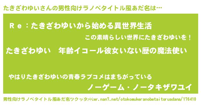 | 女子向けラノベタイトル風あだ名 | 『たきざわゆいの玉の輿計画!』 |