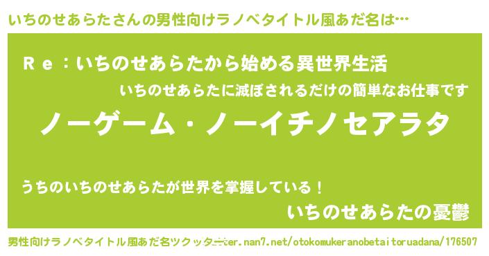 | 胡散臭い通販商品みたいなあだ名 | 『お金では代えられない隕石のかけら…その名も「いちのせあらた」』 |
