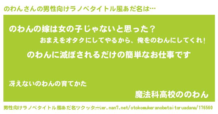 | 女子向けラノベタイトル風あだ名 | 『横柄のわんと宰相陛下』『のわん恋絵巻』 |