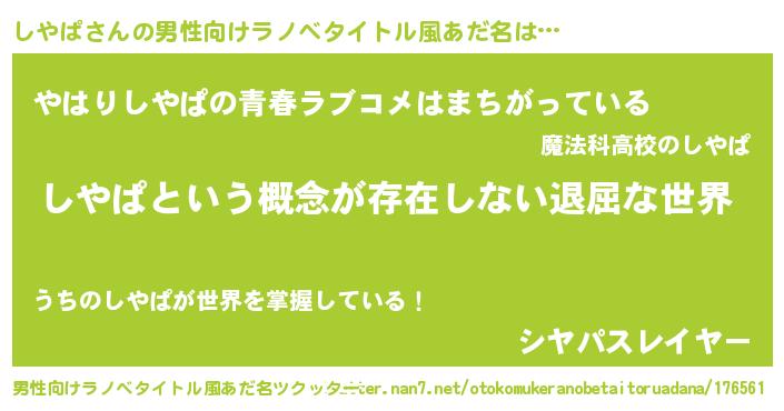 | 女子向けラノベタイトル風あだ名 | 『しやぱの契約王妃』『しやぱ伯爵の花嫁』 |