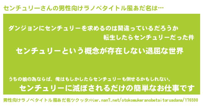 | 胡散臭い通販商品みたいなあだ名 | 『絶対に幸福をもたらす健康食品…その名も「センチュリー」』 |
