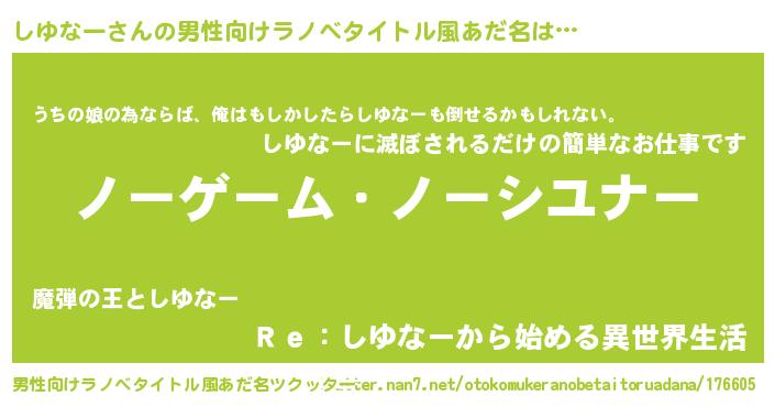 | 女子向けラノベタイトル風あだ名 | 『しゆなー恋絵巻』『しゆなー伯爵の花嫁』 |