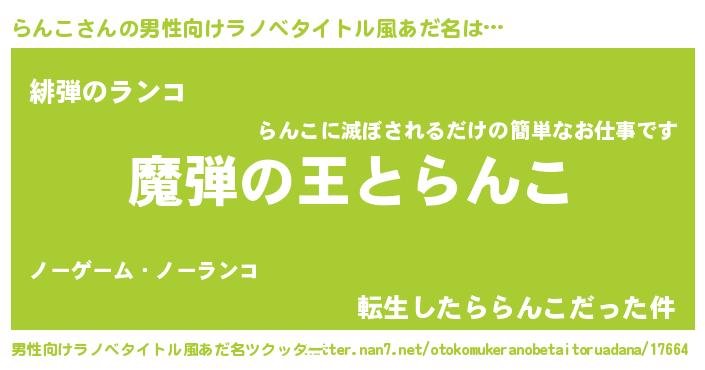 | 女子向けラノベタイトル風あだ名 | 『乙女ゲームの破滅フラグしかない悪役らんこに転生してしまった…』 |