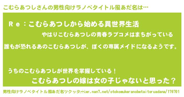 | 女子向けラノベタイトル風あだ名 | 『こむらあつしの契約王妃』 |