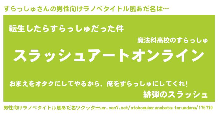 | 胡散臭い通販商品みたいなあだ名 | 『億万長者になれるブレスレット…その名も「すらっしゅ」』 |
