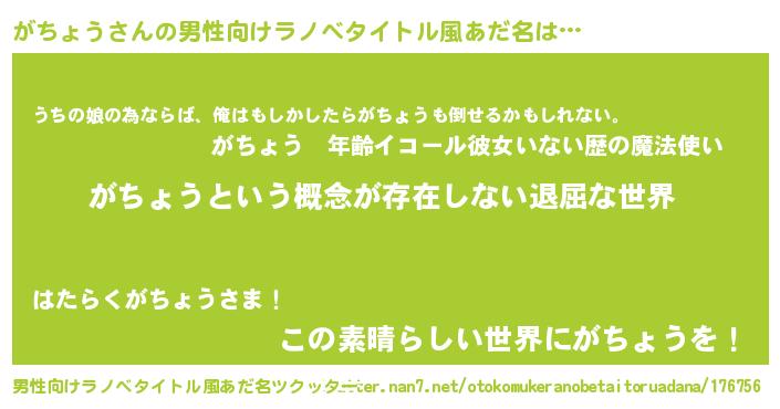 | ヘコむあだ名 | 『がちょう(小並感)』『酢こんぶ』 |
