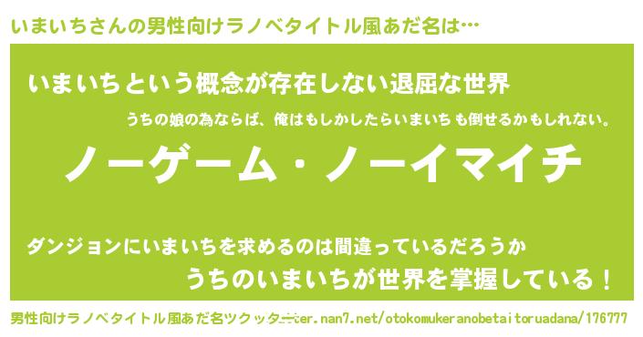 | 女子向けラノベタイトル風あだ名 | 『死神いまいちの再婚』 |