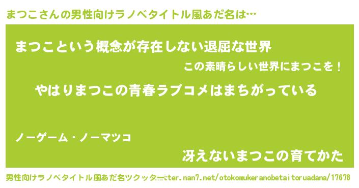 | 女子向けラノベタイトル風あだ名 | 『まつこ伯爵の花嫁』『死神まつこの再婚』 |