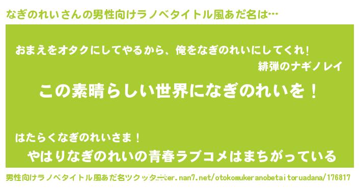 | 女子向けラノベタイトル風あだ名 | 『乙女ゲームの破滅フラグしかない悪役なぎのれいに転生してしまった…』 |