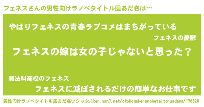 | 女子向けラノベタイトル風あだ名 | 『フェネスの卵を拾いまして』 |