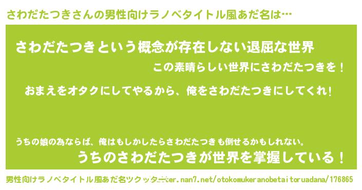 | 女子向けラノベタイトル風あだ名 | 『さわだたつき夫妻のなれそめ』 |