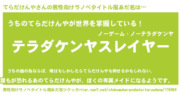 | 胡散臭い通販商品みたいなあだ名 | 『絶対に幸福をもたらす水素水…その名も「てらだけんや」』 |