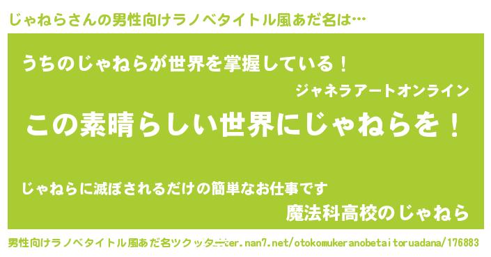 | 胡散臭い通販商品みたいなあだ名 | 『あなたにだけ特別に提供する限定10本のレアな日本酒…その名も「じゃねら」』 |