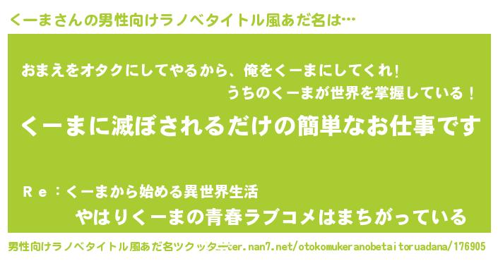 | 女子向けラノベタイトル風あだ名 | 『横柄くーまと宰相陛下』『くーま恋絵巻』 |