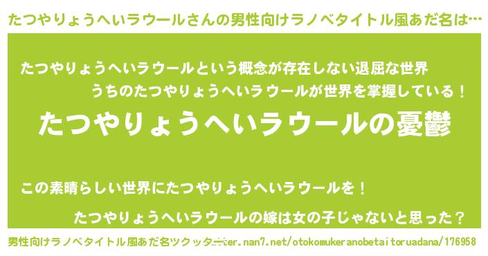 | 女子向けラノベタイトル風あだ名 | 『(仮)たつやりょうへいラウールのやんごとなき事情』 |