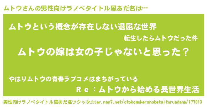 | 女子向けラノベタイトル風あだ名 | 『ムトウ様がみてる』『ムトウの契約王妃』 |
