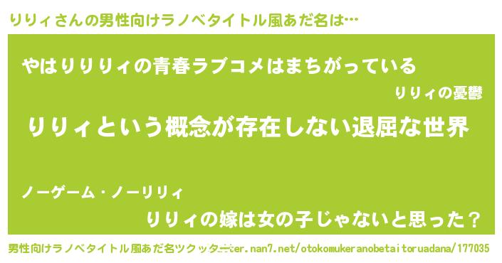 | 女子向けラノベタイトル風あだ名 | 『異世界で失敗しない100のりりィ』 |
