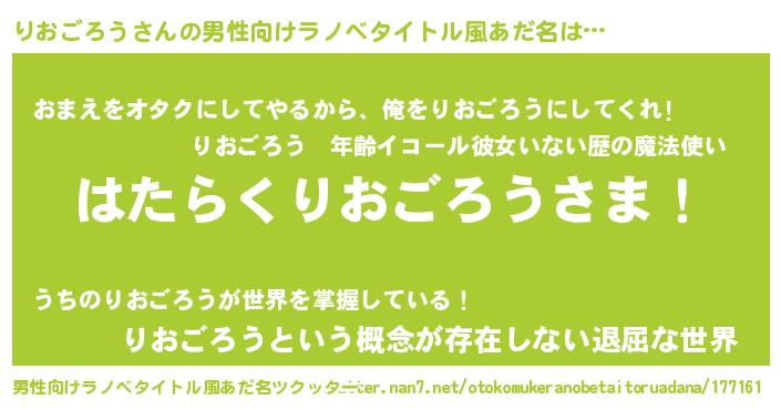 | 伝説のあだ名 | 『魔王と互角に渡り合う錬金術士りおごろう』 |