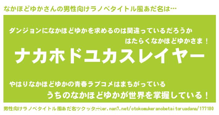 | 胡散臭い通販商品みたいなあだ名 | 『信頼と実績のサプリメント…その名も「なかほどゆか」』 |
