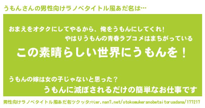 | 胡散臭い通販商品みたいなあだ名 | 『あなたにだけ特別に提供する限定10本のレアな日本酒…その名も「うもん」』 |
