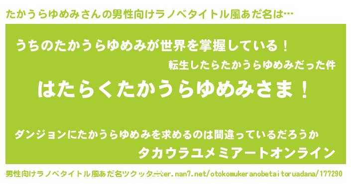 | 胡散臭い通販商品みたいなあだ名 | 『必ず成功するブレスレット…その名も「たかうらゆめみ」』 |