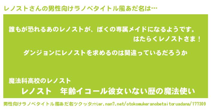 | 女子向けラノベタイトル風あだ名 | 『レノストの卵を拾いまして』 |