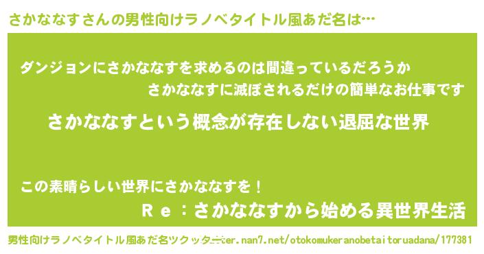 | 胡散臭い通販商品みたいなあだ名 | 『絶対に幸福をもたらす水素水…その名も「さかななす」』 |