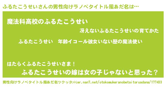 | 女子向けラノベタイトル風あだ名 | 『ふるたこうせいの玉の輿計画!』 |