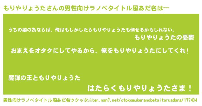 | 女子向けラノベタイトル風あだ名 | 『もりやりょうた夫妻のなれそめ』 |