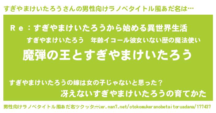 | 意味不明あだ名 | 『住所不定無職すぎやまけいたろう(40歳)』 |