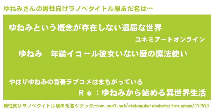 | 女子向けラノベタイトル風あだ名 | 『ゆねみの玉の輿計画!』『闇のゆねみ』 |
