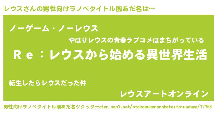 | 女子向けラノベタイトル風あだ名 | 『闇のレウス』『死神レウスの再婚』 |