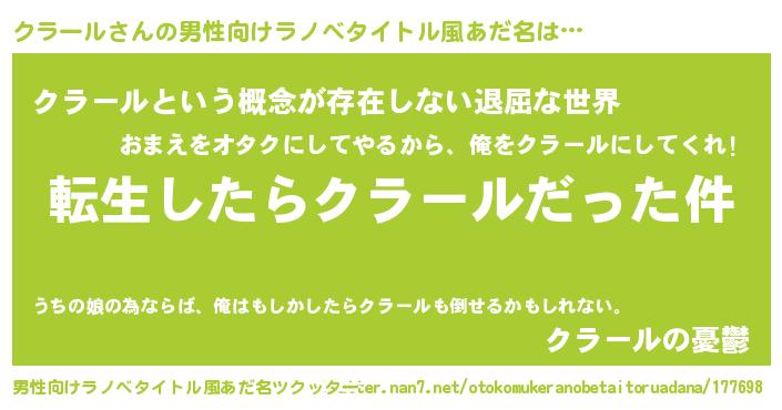 | 胡散臭い通販商品みたいなあだ名 | 『来世でも幸せになれる招き猫…その名も「クラール」』 |