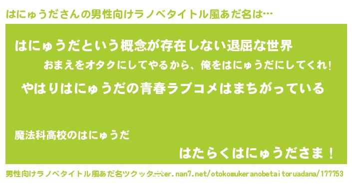 | 女子向けラノベタイトル風あだ名 | 『はにゅうだの雑貨屋さん』 |