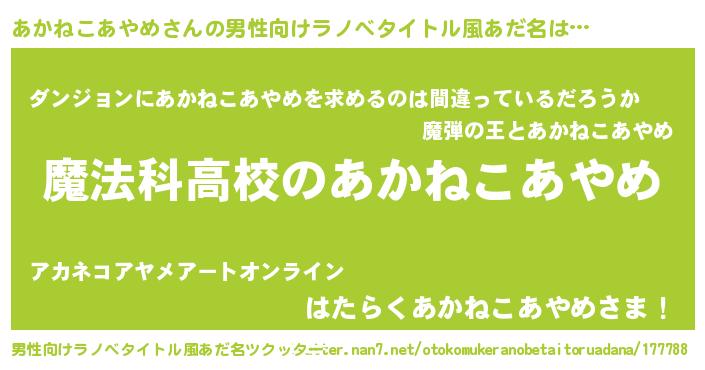 | 女子向けラノベタイトル風あだ名 | 『あかねこあやめなんてお断りですっ。』 |