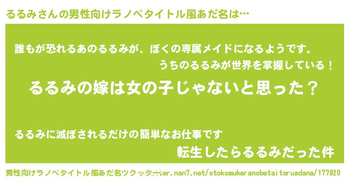 | 女子向けラノベタイトル風あだ名 | 『るるみの卵を拾いまして』 |
