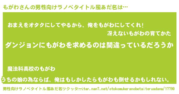 | 胡散臭い通販商品みたいなあだ名 | 『信頼と実績のサプリメント…その名も「もがわ」』 |