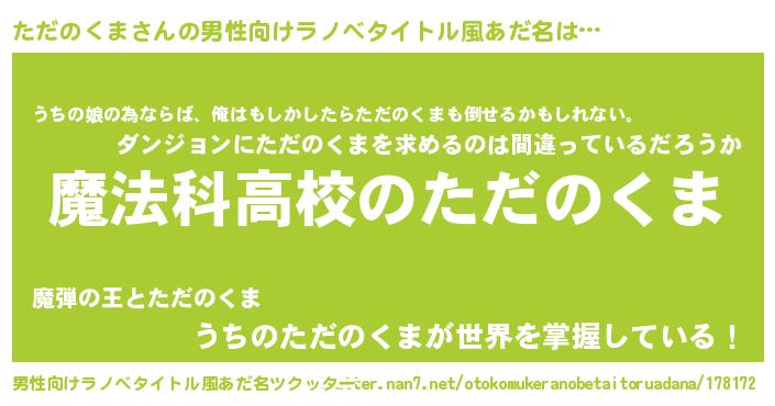 | 女子向けラノベタイトル風あだ名 | 『ただのくまなんてお断りですっ。』 |