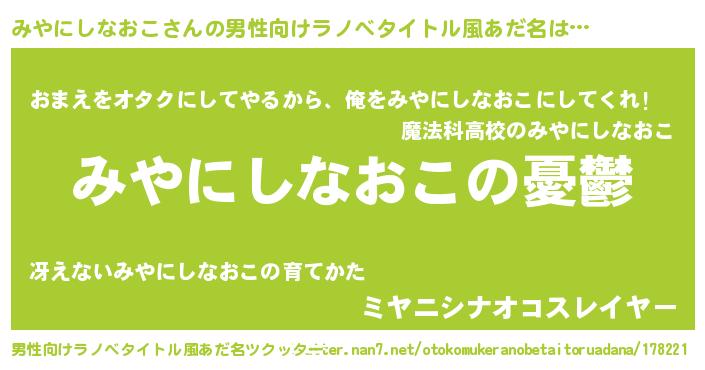 | ヘコむあだ名 | 『みやふぇ~』『みやにしなおこ(小並感)』 |