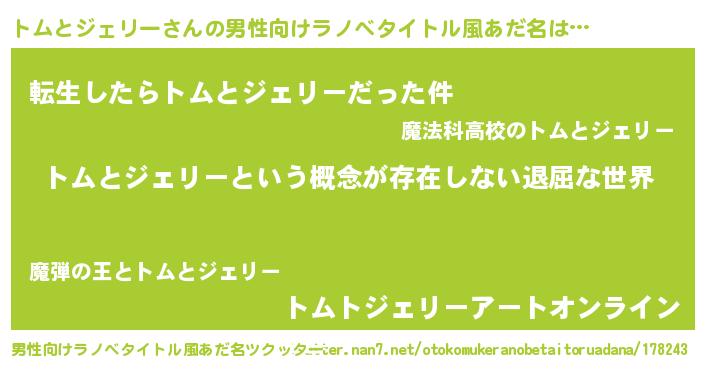 | 女子向けラノベタイトル風あだ名 | 『異世界で失敗しない100のトムとジェリー』 |