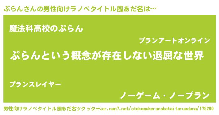 | 女子向けラノベタイトル風あだ名 | 『ぷらんの契約王妃』『ぷらん恋絵巻』 |
