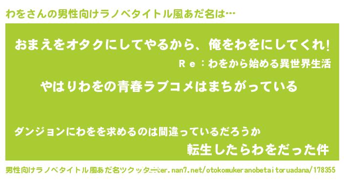 | 女子向けラノベタイトル風あだ名 | 『わをの雑貨屋さん』 |
