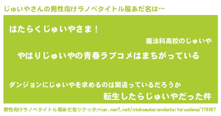 | 女子向けラノベタイトル風あだ名 | 『じゅいやの雑貨屋さん』 |