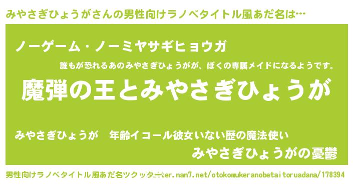 | 女子向けラノベタイトル風あだ名 | 『みやさぎひょうがが死なない童話 林檎のみやさぎひょうがの診療簿』 |
