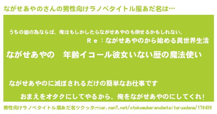 | 女子向けラノベタイトル風あだ名 | 『ながせあやのの玉の輿計画!』 |