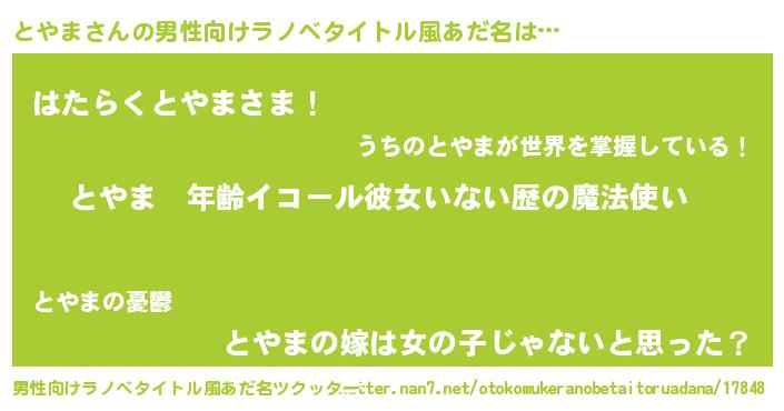 | 女子向けラノベタイトル風あだ名 | 『とやまの玉の輿計画!』 |