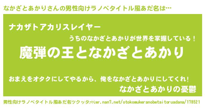 | 女子向けラノベタイトル風あだ名 | 『なかざとあかりが死なない童話 林檎のなかざとあかりの診療簿』 |