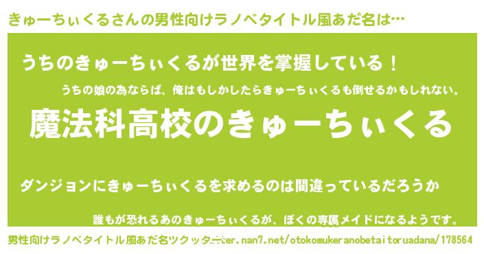 | 女子向けラノベタイトル風あだ名 | 『きゅーちぃくるなんてお断りですっ。』 |