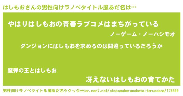 | 女子向けラノベタイトル風あだ名 | 『はしもおは平凡を望む』 |